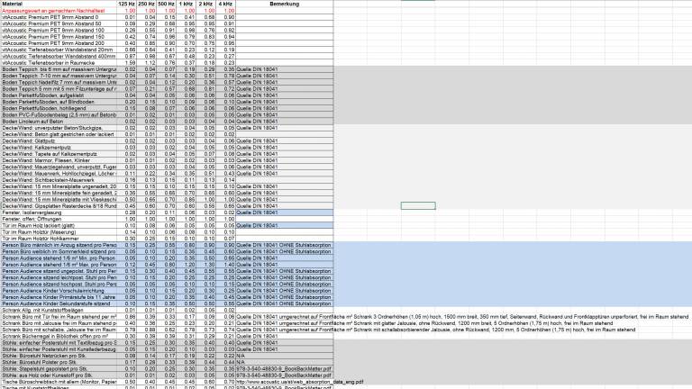 The calculations are based on measured data from objects and materials. Some of these are listed in the DIN 18041 exemplary. Others are taken from various sources for their correctness and conformity with the actual existing object or material there is no guarantee.
