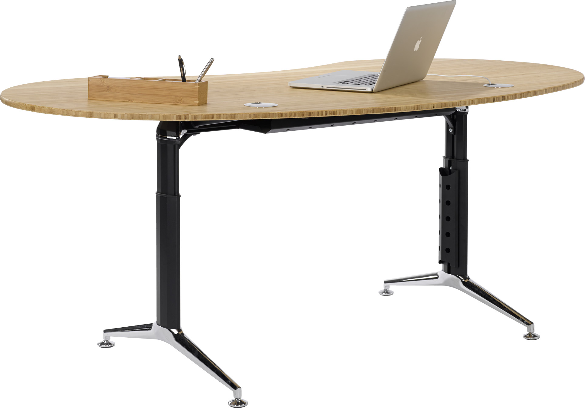 Rounding the table tops allows a completely free placement of desks that can adapt even to difficult spatial conditions. It leads to: gaining more space efficiency, stress reduction through optimized privacy (Feng Shui), flexibility in the arrangement of the tables and creation of working groups, manifold diversity in planning and reserve for future workplace extensions. A sustainable furniture concept, optimized for restructuring, conversions and relocations in other rooms. Another positive design feature with regard to aesthetic interior design is the different optical effects (subtlety): Same size round shapes are perceived less voluminous than angular ones.