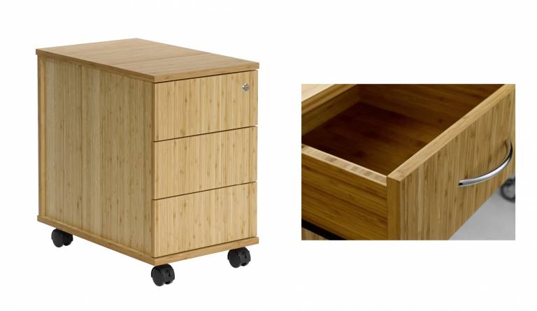 Bamboo office design pedestal with 3 drawers, completely in bamboo solid wood 18 mm coffee oiled. WDH: 356x600x585mm. All drawers also in solid wood Bamboo with hidden runners including soft close, central locking and breakable castors.