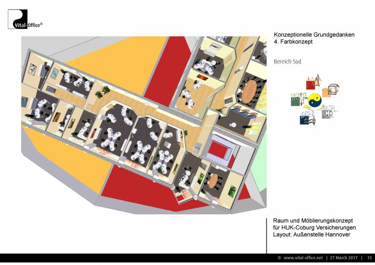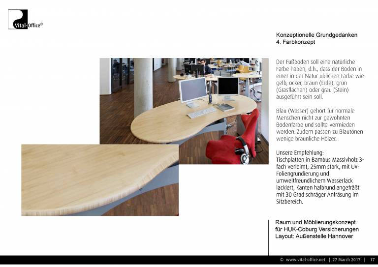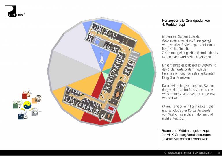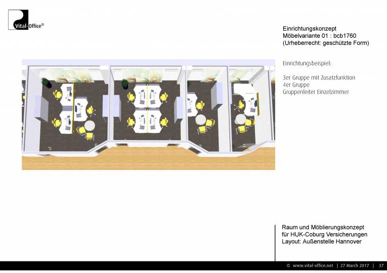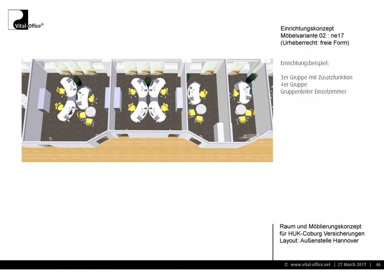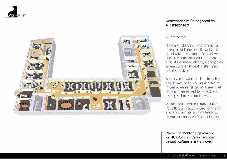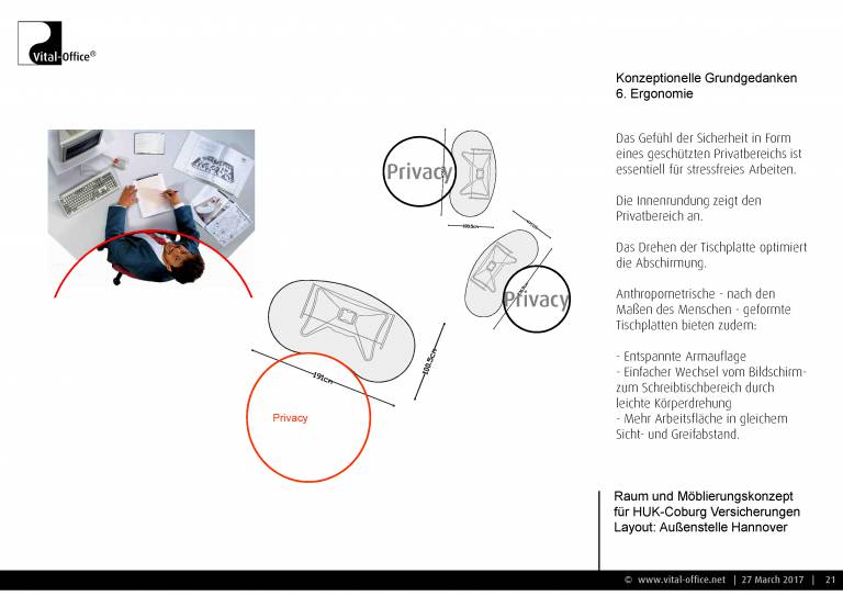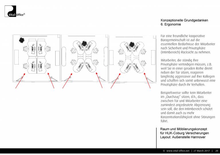 Beispielsweise sollte kein Mitarbeiter im „Durchzug“ sitzen, d.h., dass zwischen Tür und Mitarbeiter eine zumindest angedeutete Abgrenzung sein soll, die den Intimbereich schützt und damit auch zu mehr Konzentrationsfähigkeit ohne Störungen führt.