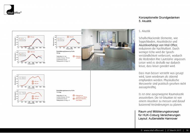 Schallschluckende Elemente, wie Teppichboden, Akustikdecke und Akustikvorhänge von Vital-Office, reduzieren die Nachhallzeit. Durch weniger Echo wird die Sprach-verständlichkeit verbessert, wodurch
