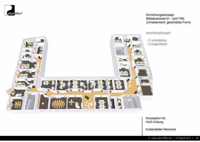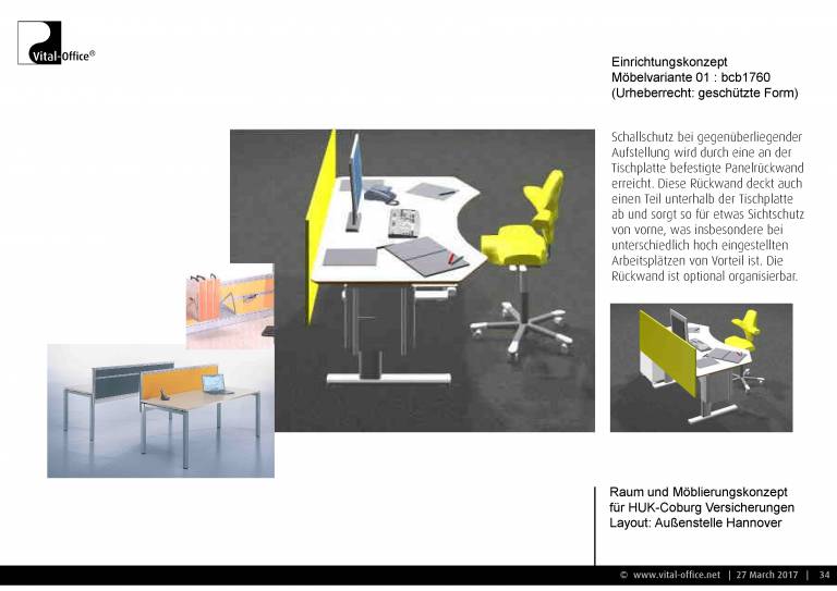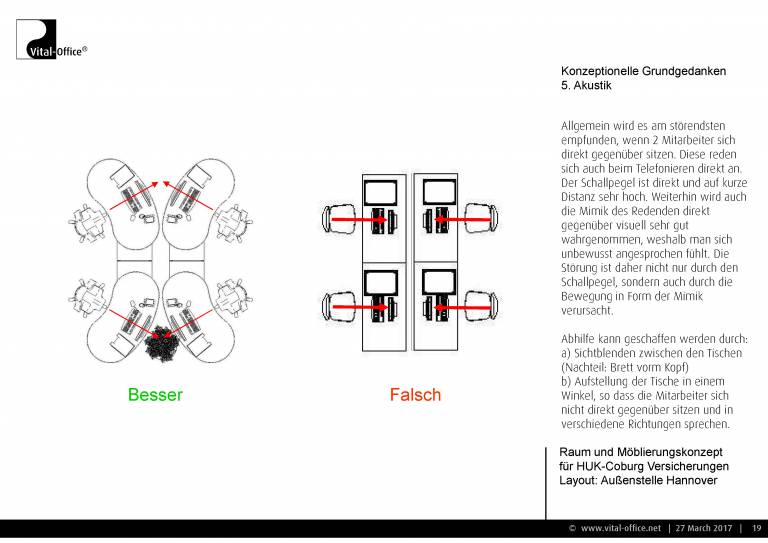 b) Aufstellung der Tische in einem Winkel, so dass die Mitarbeiter sich nicht direkt gegenüber sitzen und in verschiedene Richtungen sprechen.