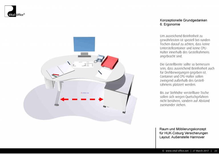 Um ausreichend Beinfreiheit zu gewährleisten ist speziell bei runden Tischen darauf zu achten, dass keine Unterstellcontainer und keine CPU-Halter innerhalb des Gestellrahmens angebracht sind.