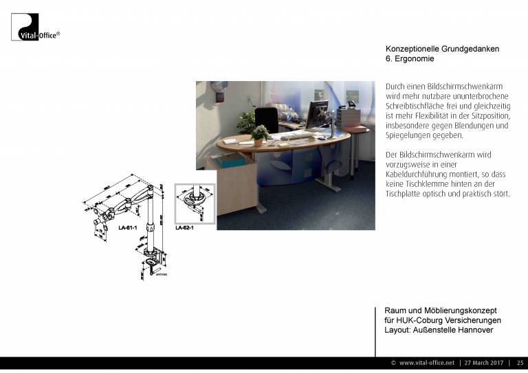 Durch einen Bildschirmschwenkarm wird mehr nutzbare ununterbrochene Schreibtischfläche frei und gleichzeitig ist mehr Flexibilität in der Sitzposition, insbesondere gegen Blendungen und Spiegelungen gegeben.