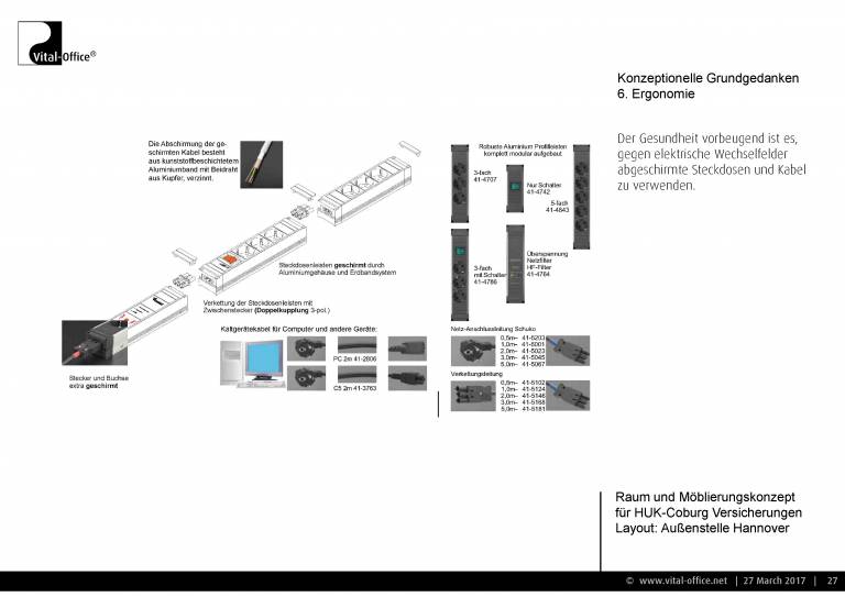 Es hat sich dagegen bewährt, Steckdosenleisten direkt unter der Arbeitsplatte stabil anzuschrauben, so dass Geräte leicht und sicher eingesteckt werden können. Abklappbare Kabelwannen und flexible Kabelhalter bieten dann eine einfache schnelle Möglichkeit die Kabelüberlängen und ggf. Netzteile unterzubringen.