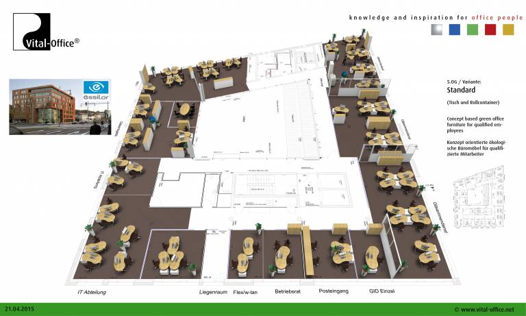 Unterschiedliche Planungslösungen für Essilor in Freiburg sind in Zusammenarbeit mit unserer FengShui Beraterin und Partnerin Frau Silke Sumana Körbs entstanden. Standard“ und „Vertikal Space Plus“ sind gelungene Bespiele dafür, dass sich Gegensätze anziehen können. Schlichte rechteckige Sideboards unterstreichen die Wirkung der ergonomischen Vital-Office Tische und umgekehrt. Bei Vertikal Space Plus ersetzen zudem Caddys auf Rollen konventionelle Standard Rollcontainer der Mitarbeiter am Arbeitsplatz. Die Caddys sind wahre Organisationstalente, bestehend aus einem Basismodul, das nach Bedarf des Mitarbeiters unterschiedlich mit Schüben und Leerfächern ausgestattet werden kann. Pflanztröge schaffen ein zusätzlich positives Raumklima.
