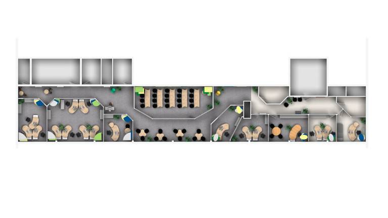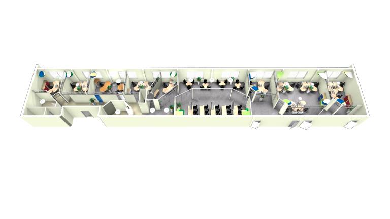 Unser Vital-Office Konzept lässt mittig des Gesamtgrundrisses ein „Herzstück Kommunikation“ entstehen, um das sich die Büros orientierten. Der Flurbereich passt sich den Räumlichkeiten mäanderförmig an, sodass sich für die Nutzer auch dort spannende Räume ergeben. Es wurde eine Trennwand gewählt, welche zu großen Teilen aus Glaselementen beststeht, um möglichst viel Tageslicht einzufangen und die Räumlichkeiten zu bereichern. Da harte Flächen wie Glas den Schall weniger gut aufnehmen können, wurden dreidimensionale Akustikmobiles eingesetzt.