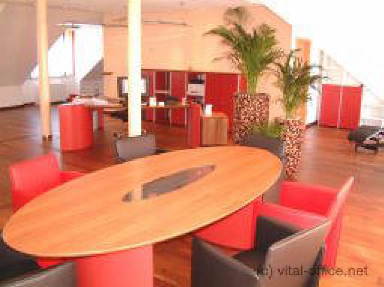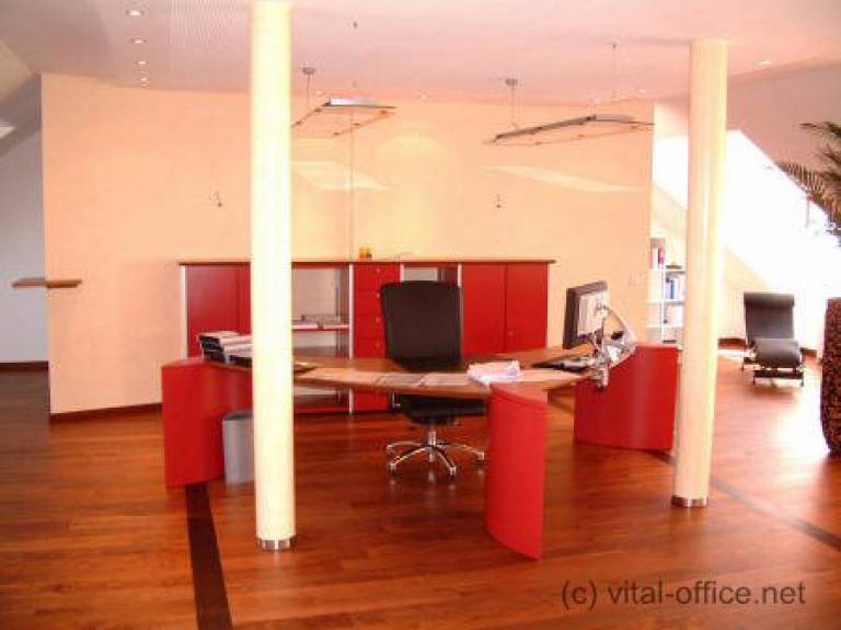 A customized desk and conference table with molded bases in red