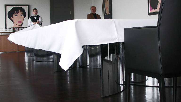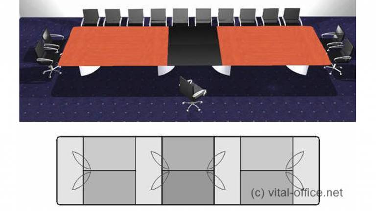 Conference and dining table 9,12x 2,0m. Segmented top with changing veneer orientation and a combination with black tops in Linoleum desktop.