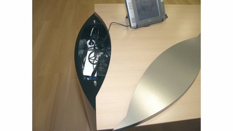 Elegant manager desks for attorneys and doctors with media and power outlets. The circon desks offer a covered cable tray in the molded feet, with plenty of room for electrical sockets, power supplies and a cable conduit from foot to foot.