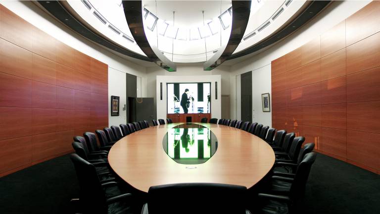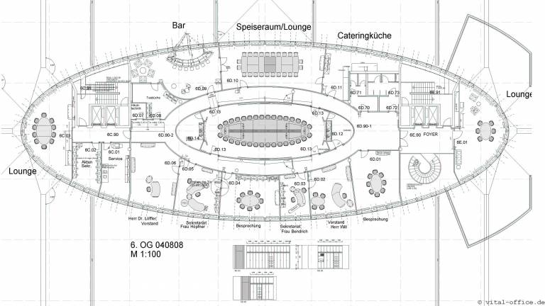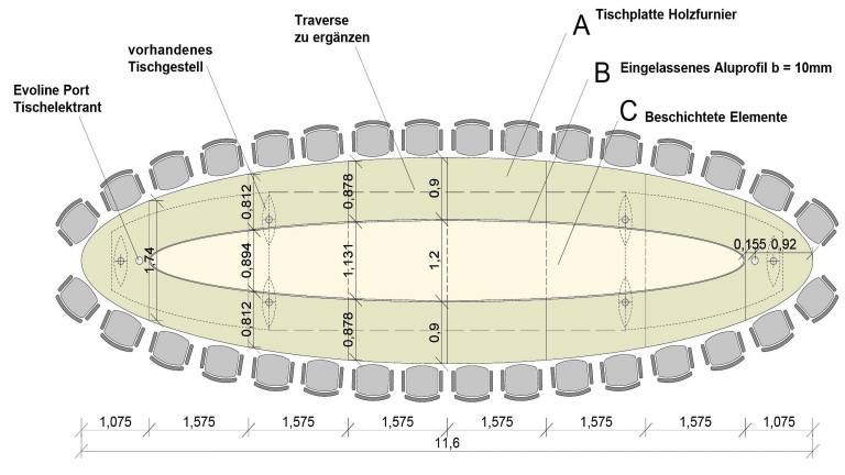 The Oval-Office Project in Hamburg is a successful example where an oval 11,6 m- long table veneered in Swiss pear tree combined with stone Nero Assoluto was designed to accommodate 38 persons in their executive suite conference room.