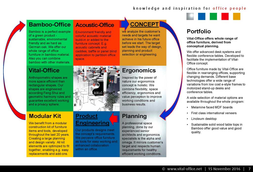 Vital-Office Intro, Unternehmensgrundsätze, Historie, Qualität, Umweltfreundlich und Gesund, Deutsche oder Chinesische Produktion, Portfolio, Geschäftsfelder, Produkte und Dienstleistungen