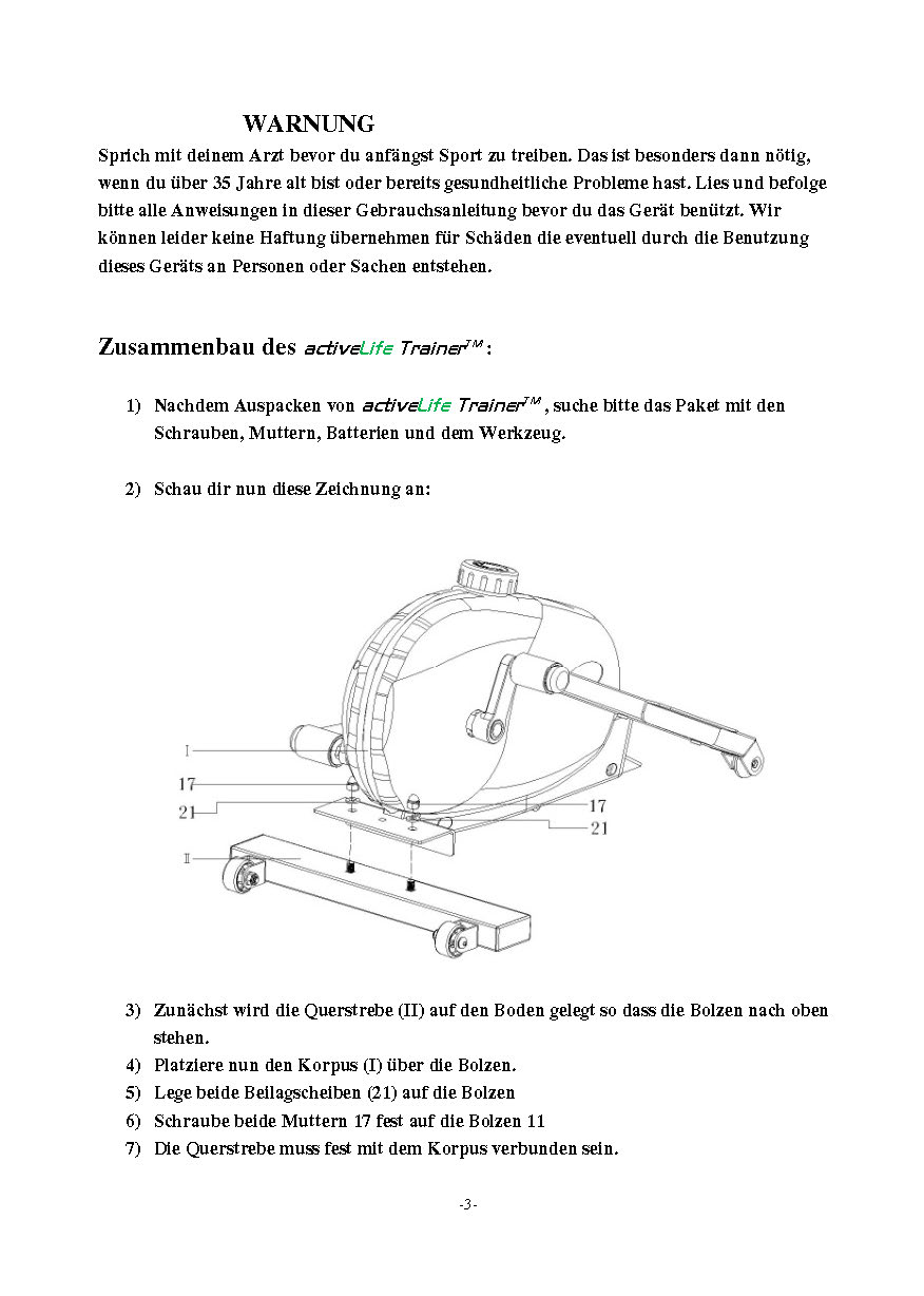 Congratulations on the purchase of this activeLife TrainerTM1! Before you start using your new dynamic seat machine, please unpack it and build it together. Then find a suitable place under your desk or in front of a chair or armchair where you want to put the device. In order to ensure safe use at any time, please read and follow all instructions in this manual.