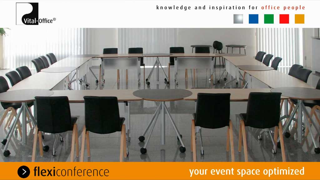 Flexiconference ist ein von Vital Office entwickeltes Konzept um den hohen Ansprüchen an moderne und flexible Konferenzräume gerecht zu werden. Flexiconfernece ermöglicht Ihnen wandelbare Konferenz-, Seminar- und Schulungsräume die allen Anforderungen entsprechen. Profitieren Sie von den vielfältigen Stellmöglichkeiten der flexiconference Klapptische und Konferenztische.