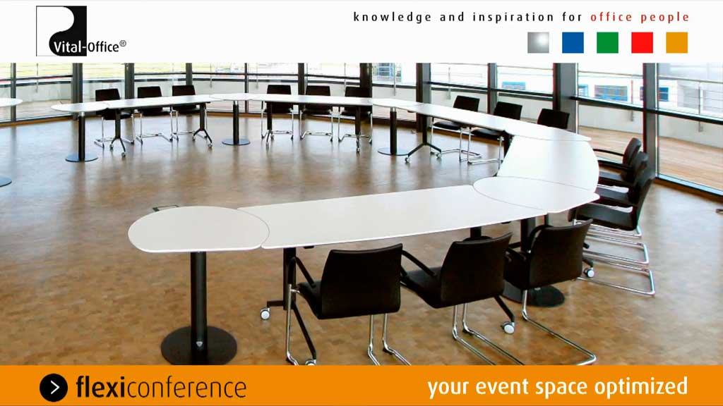 With Vital Office Flexi Conference you can easily arrange your conferences, presentations and trainings to fit your needs – best suited to the situation and number of participants. Your benefit: Only 2 table-top forms enable you optimal arrangements for your meeting, presentation, conference, training, banquet, event and reception.
