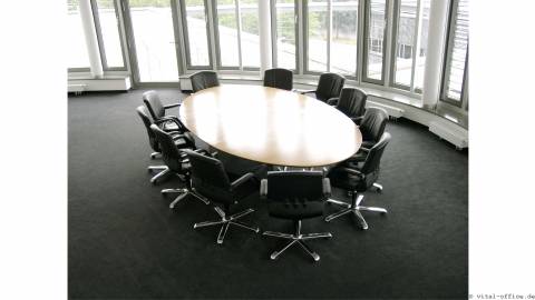 Conference table for 22 persons boat elliptical-shaped 7.5 x 1.8 m with red lacquered glass insert. Mini media control: with just a few hand movements is a notebook system from…