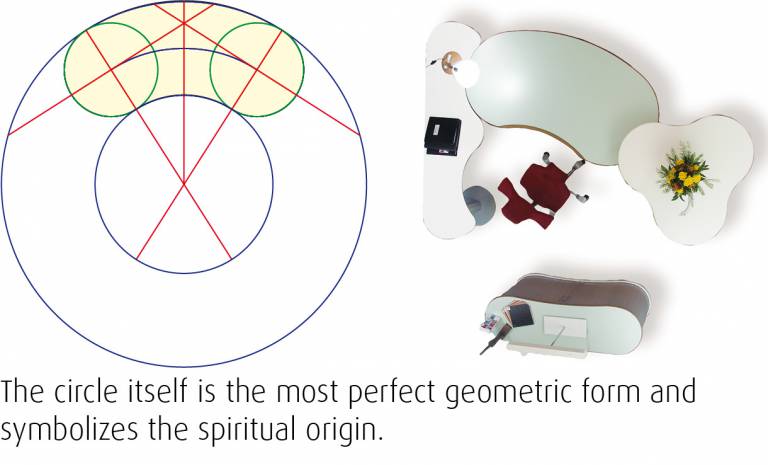 The logical analysis of the effect of round forms is very difficult and never complete. A round-shaped desk is a combination of several geometries. Simple changes in size and changes of individual radii change the relations within the form and result in a totally different effect.