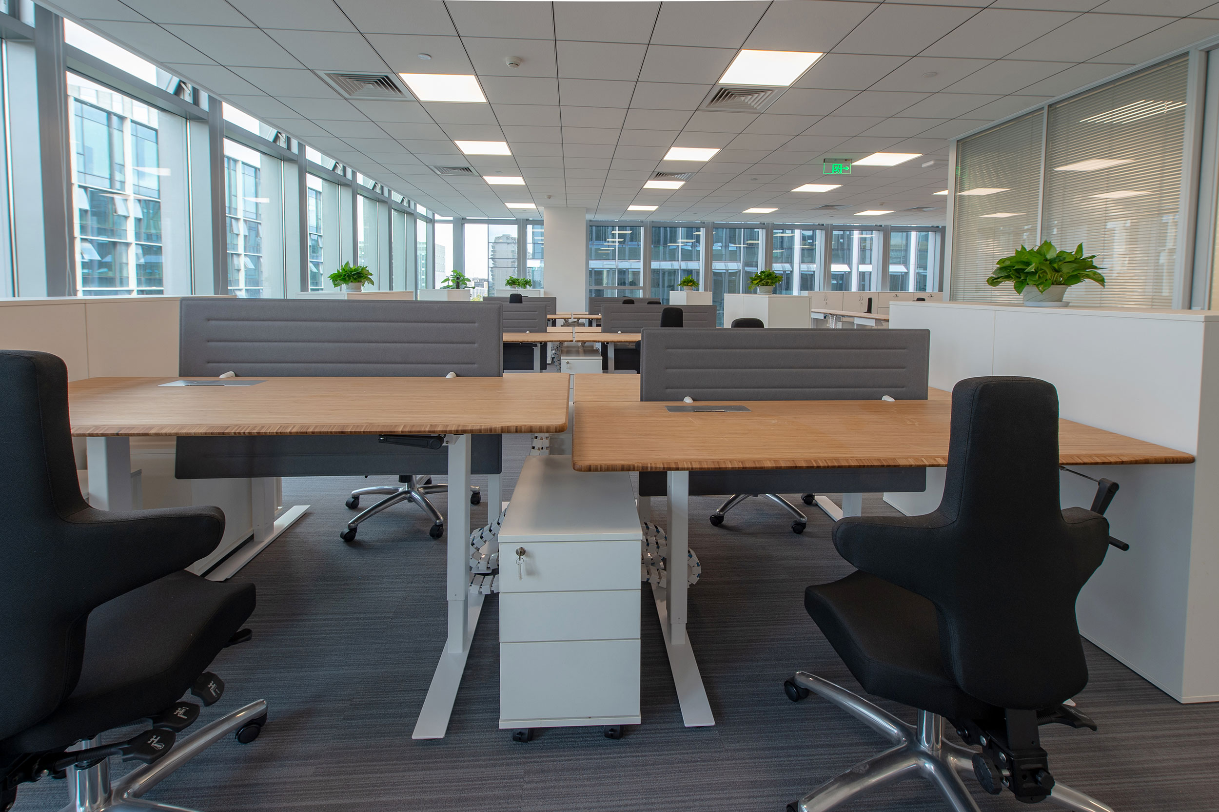 5 years after the furnishing of Jungheinrichs new factory, Vital-Office is again the supplier for Jungheinrichs new HQ and SO. Green bamboo desks are chosen again. Rectangular desk tops with height adjustable bases are added new. And the ergonomic saddle like WEY-chair was choosen again, but in 3rd generation technique and design. Electric installation and plug-in possibilities from top of table and from below table top was a special concern. Acoustic partitions are especially made for height adjustable stand-up desks. The acoustic panel is lifted always by the highest table top. This ensures, that all sticky notes on the screens are always available to the users on both sides.