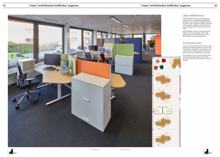 Due to the special geometry of the desk, very advantageous workplace groupings result. The offset of the tables to each other is very pleasant. Direct counterparts are avoided. Instead, harmoniously spacious rooms are created between the desks. Each employee receives a personal caddy, which is parked in the caddy garage on home office days. Desk sharing is thus practiced in areas of the company.