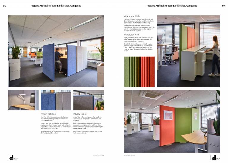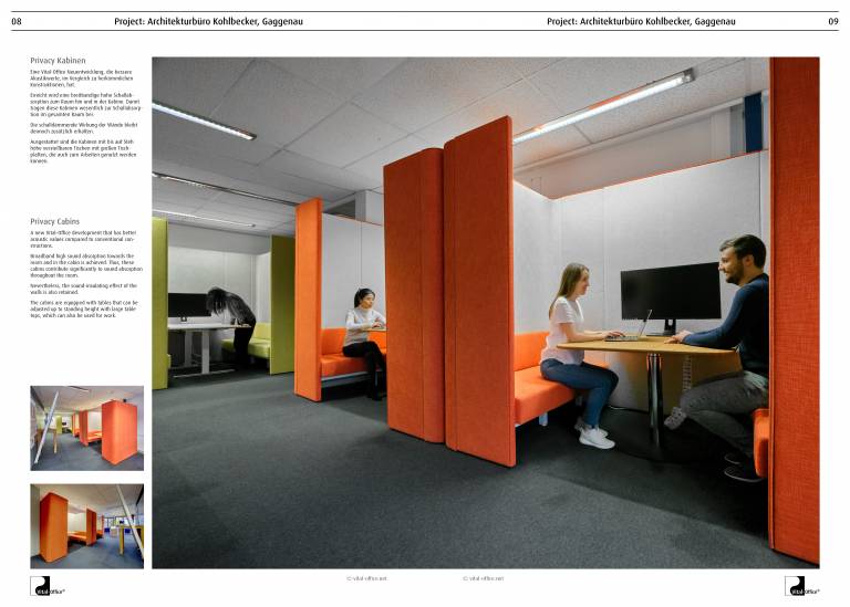 A new Vital-Office development that has better acoustic values compared to conventional constructions. Broadband high sound absorption towards the room and in the cabin is achieved. Thus, these cabins contribute significantly to sound absorption throughout the room.