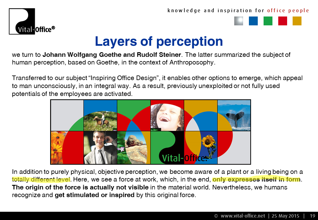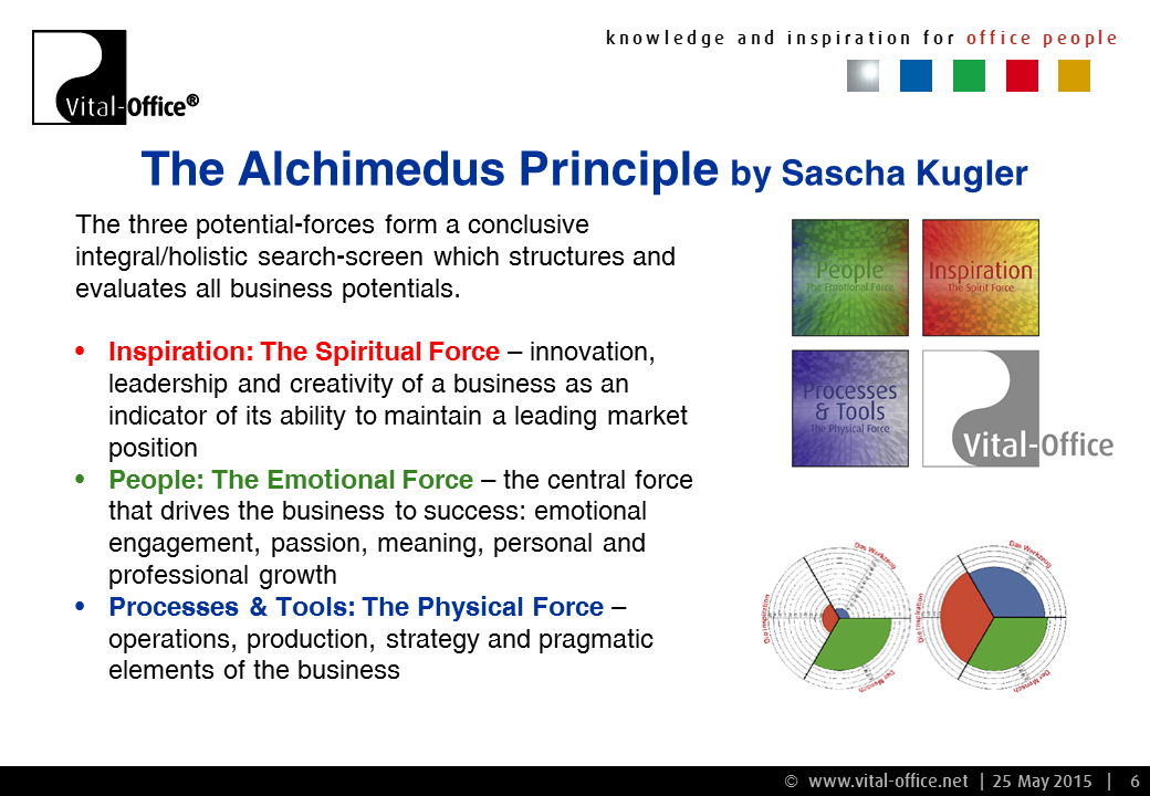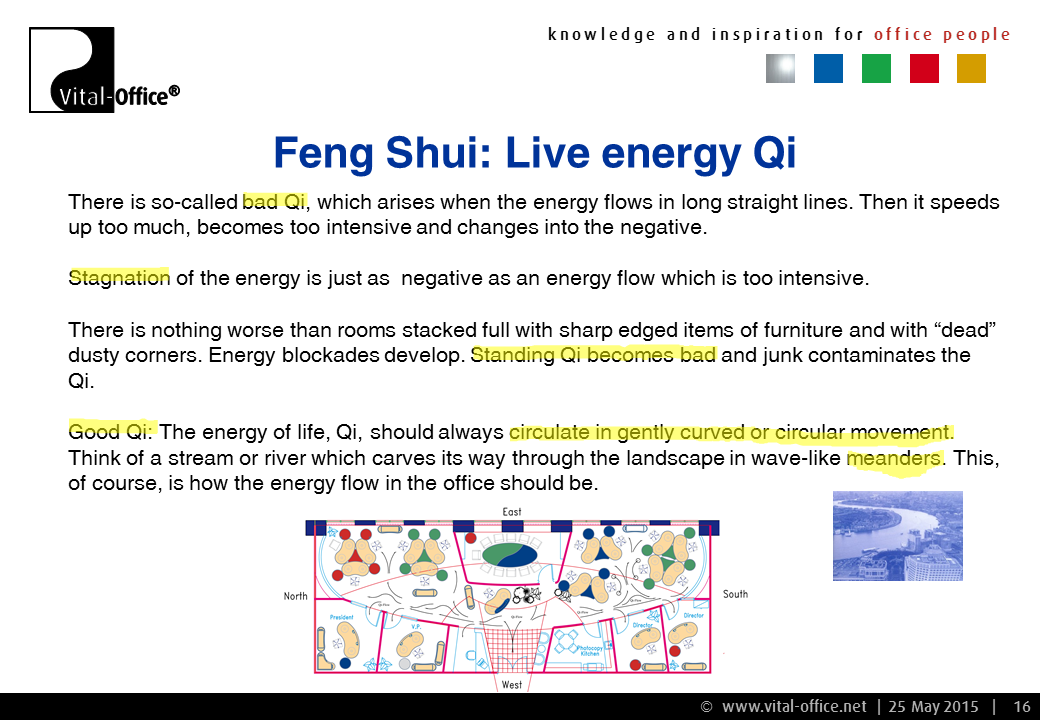 Statistics like Gallup show how difficult it is to achieve business excellence and a self-learning organization with engaged employees and team working. Well engineered factories are half of the success. Neglecting the importance of office design results in a rigid, restriction driven organization. All Statistics and TQM studies show that Team working is the main key to sustainable success. To achieve team working in our offices, we need overcome the Cartesian division and perceive the organization as integral system (likewise in Business excellence). Feng Shui, in the selected and scientifically analyzed way of the Vital-Office Concept offers practical methods to analyze and implement working organizational structures with the help of environmental stimulation towards attitude, quality, collaboration and Team work.
