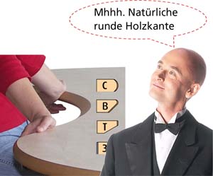 • Kanten: rundum mit Profilkante Typ (siehe Auswahlfeld), (inklusive) Option Wohlfühlkante mit Softtouch - Skulpturartige angefaste Profilierung der Tischplatte in der Innenrundung