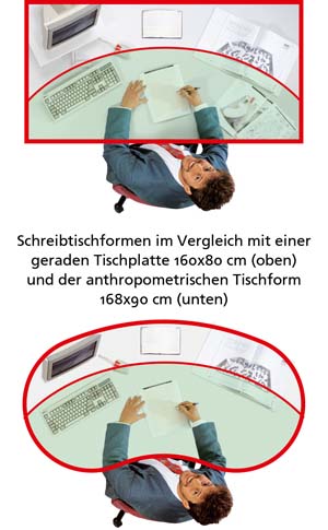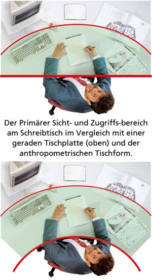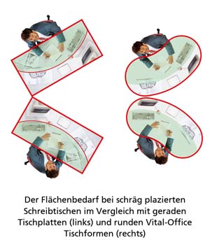 Vital Office Tischflächen erweitern sich zum Benutzer hin, ersetzen herkömmliche Winkelkombinationen und reduzieren somit Stellfläche. Durch einfache Körperdrehung werden alle Arbeitsmittel erreicht. In der Gallerie finden Sie Bilder, die den Primäreren Sicht- und Zugriffs-bereich am Schreibtisch im Vergleich mit einer geraden Tischplatte (oben) und der anthropometrischen Tischform darstellen. Weitere Vorteile bestehen darin, zwischen Bildschirm und Schreibtisch bequem zu wechseln und gesundheitlichen Belastungen der Armgelenke vorzubeugen, indem diese entspannt auf der Tischplatte aufliegen. Vorteile bezüglich der Alterssichtigkeit (Presbyopie) entstehen dadurch, dass die Arbeitsmittel zentrisch in etwa gleichem Abstand zu den Augen angeordnet werden können