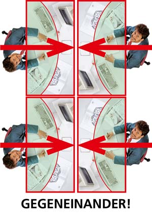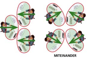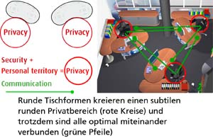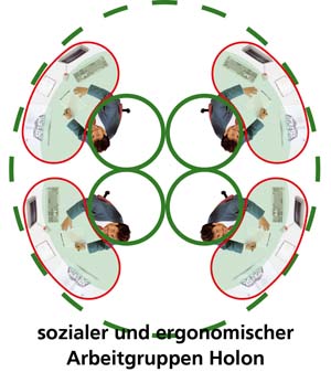 Das Büro ist ein geschäftiger Ort, der eine harmonische Atmosphäre benötigt. Die optimale Gestaltung eines ergonomischen Arbeitsplatzes orientiert sich an den menschlichen Bedürfnissen. Das Gefühl der Sicherheit in Form eines geschützten Privatbereichs ist essentiell für stressfreies Arbeiten und Grundvoraussetzung für ungezwungene freie Kommunikation und Kollaboration. Die Rückendeckung, Abschirmung und Kommando (Übersichts-) Position kann durch Drehen der Tischplatte in beliebigem Winkel optimiert werden. Sie fügen sich soft in ihre Umgebung ein und führen somit zu mehr Bewegung und Kommunikation, während eckige Schreibtische scharf und abgrenzend das Gegenteil bewirken.