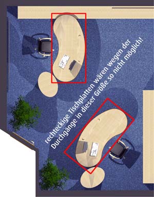 Das Abrunden der Tischplatten ermöglicht eine völlig freie Platzierung der Arbeitsplätze, die sich auch schwierigen räumlichen Gegebenheiten anpasst. Es führt zu: Gewinn von Flächeneffizienz, Stressreduzierung durch optimierte Privatsphäre, Große Flexibilität in der Anordnung der Tische und Gestaltung von Arbeitsgruppen, Enorme Planungsvielfalt und Reserve für spätere Arbeitsplatzerweiterungen. Ein langlebiges Konzept, optimiert für Umstrukturierungen, Umbauten und Umzüge in andere Räume. Ein weiteres positives Gestaltungsmerkmal hinsichtlich ästhetischer Raumgestaltung ist die unterschiedlich optische Wirkung (Täuschung):Bei gleicher Größe werden runde Formen kleiner wahrgenommen als Eckige.