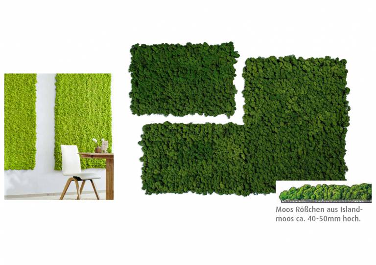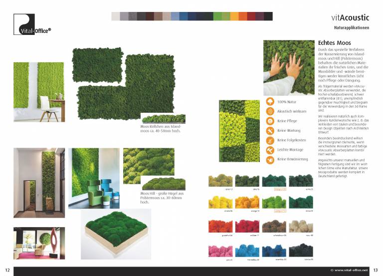 Due to the special method of conservation of Island Moss and Hill (Upholstery Moss), the natural materials retain their fresh green, and the moss images and walls do not require artificial light or care or fertilization. VitAcoustic absorber are used as carrier material, which are highly sound absorbing, flame retardant (B1), insensitive to moisture and pliable for use in the 3d frame. We also realize more complex customer requests, such as the dressing of pillars and special design objects according to architect design. The evergreen elements have a particularly impressive effect when different types of moss and coloured vitAcoustic absorber are combined. In view of our manual and filigree production, we are literally a manufactory. Our Moss products are made entirely in Germany. Our Moss is certified to import to China!