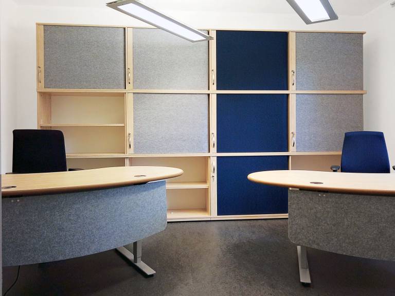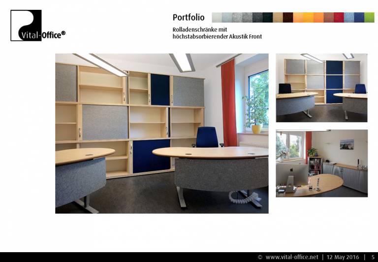 Highly sorbent, flexible vitAcoustic sound absorbers as blinds for roller shutter cabinets cost-effectively transform barriers into highly effective broadband absorbers. Following the principle of microperforation, the textile vitAcoustic panels combined with a cavity (cabinet interior) develop a nearly linear broadband absorption, especially in language-relevant areas. The vitAcoustic roller shutters, which are available in up to 50 colors, are generally cheaper than comparable PVC shutters.