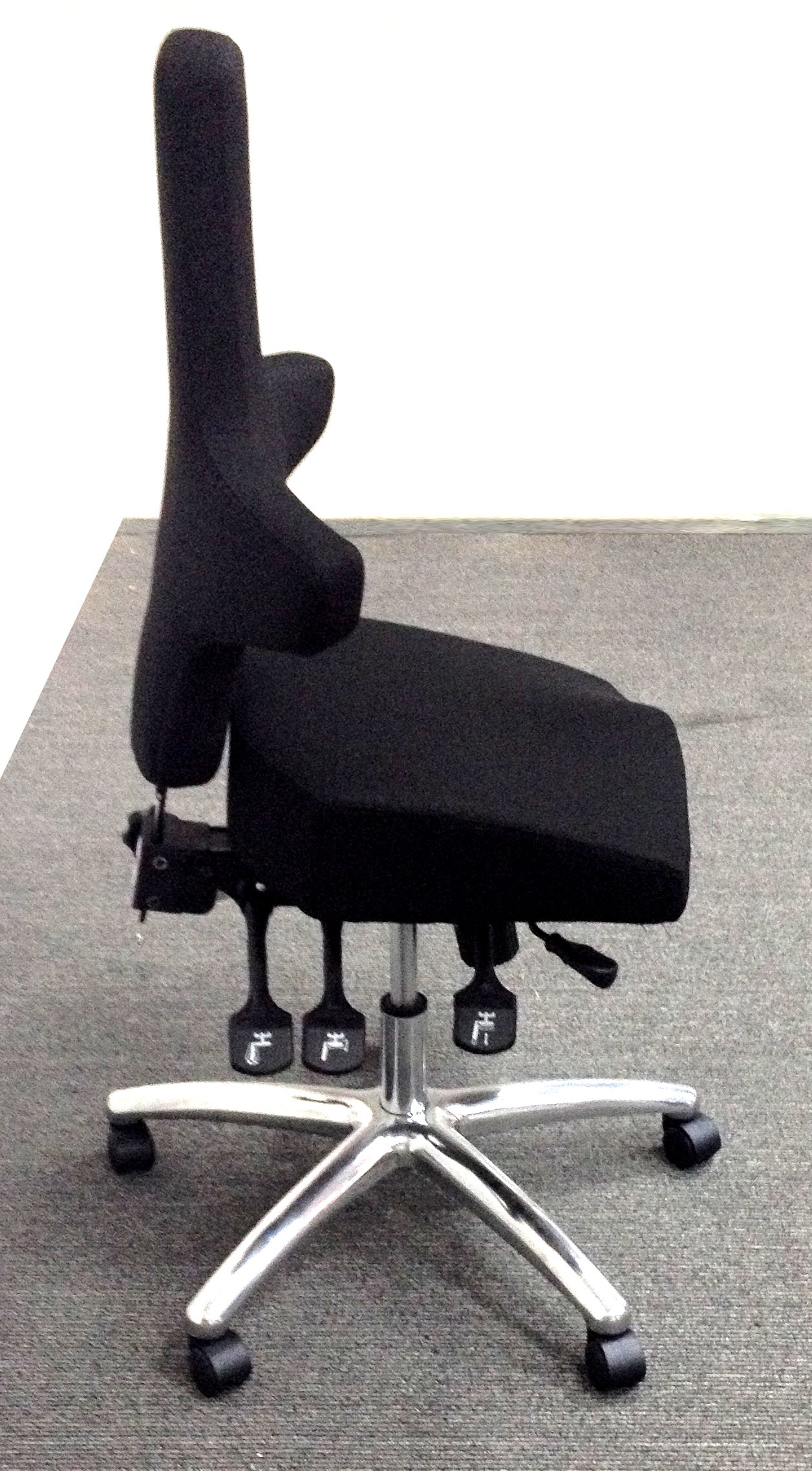 - Damit Sie nicht leicht vom Sitz herunter gleiten ist mittig im Sitz ein erhöhte sattelähnliche Wölbung. Trotzdem ist bei maximal vorgeneigter Stellung wichtig, dass beide Füße fest auf dem Boden stehen.