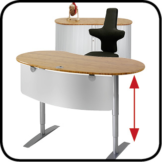 Armauflagen, die an der Tischkante anstossen behindern Sie, sich zu drehen und an die Tischkante heran zu fahren. Armauflage und Tisch sollen jedoch ergonomisch in der gleichen Höhe sein, wodurch ein Konflikt entsteht.