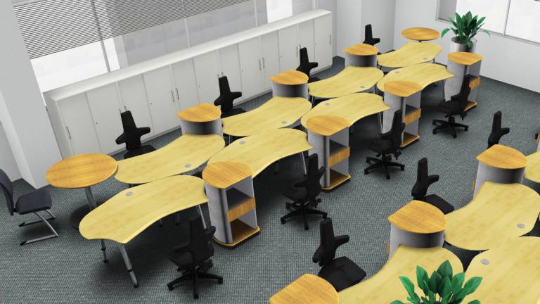 The invested ergonomic chairs and tables together with adapted ergonomic practices can further increase efficiency and productivity. The table and all equipment on top of it should suite the processes and work done by the employee. Often the Tabletops are too small, in a mess or prevent from performing well. Bigger tabletops with an inner curve, letting the employee sitting more in the center and have access to everything on his table without the need to use chair maneuvers, leads to less time, energy and tension used. Together with a well ordered tidied and no cable tangled tabletop results in better efficiency and productivity.